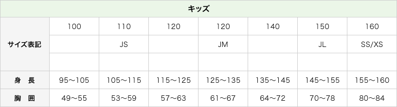 こちらの表はあくまでもお客様に合うサイズの商品を知っていただくための目安です。 年齢や体型などにより個人差がありますのでご注意ください。また、商品によっても異なりますので詳しくは各商品詳細のサイズ表で寸法をご確認ください。