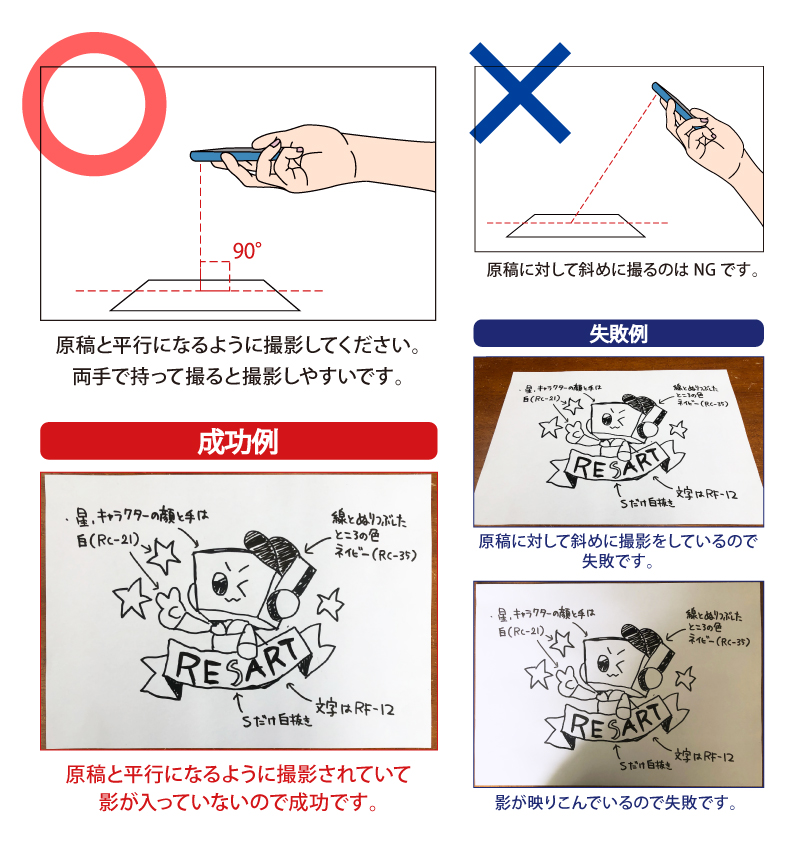 写真で撮影する場合には、原稿と平行になるようにし、影が映らないように撮影をしてください。