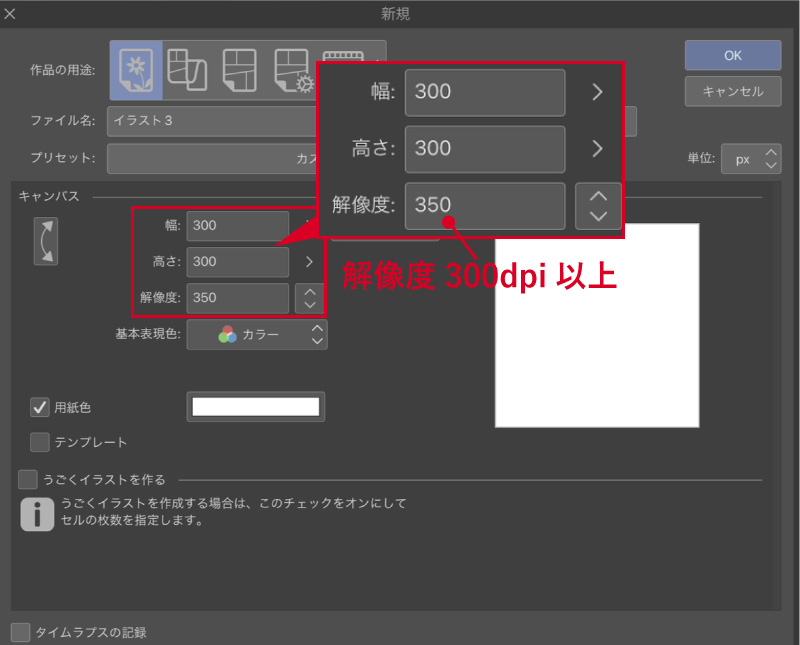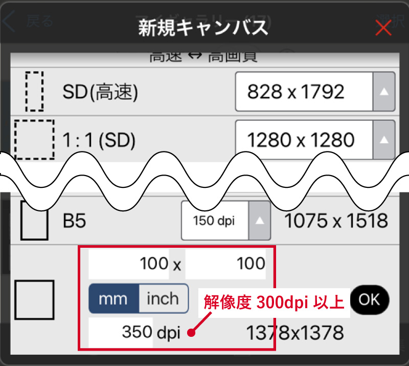 そのため、必ず描き始める前にデザインサイズを実寸サイズにして、解像度を300dpiに設定してください。