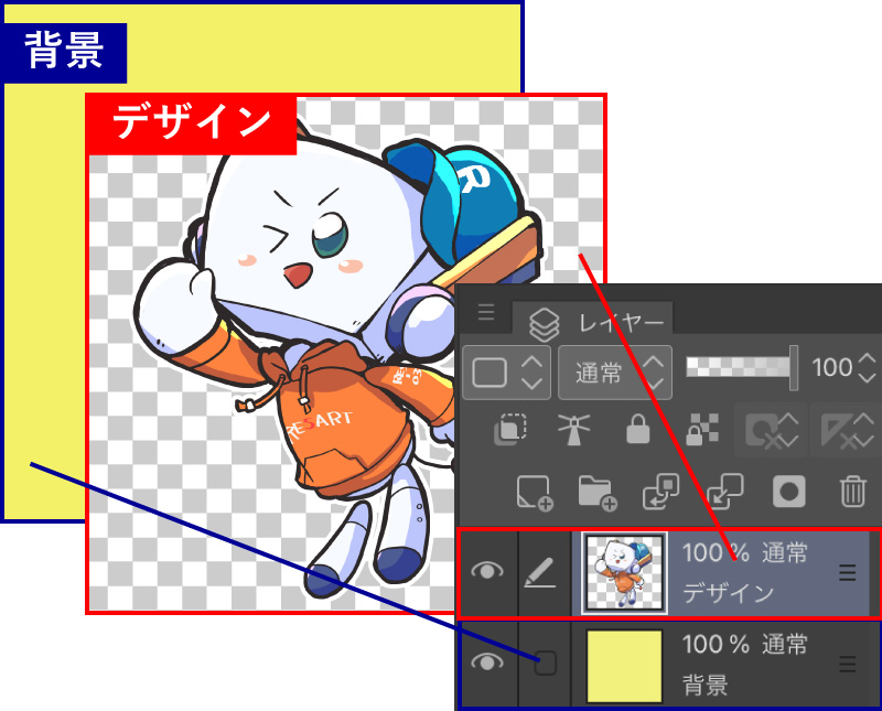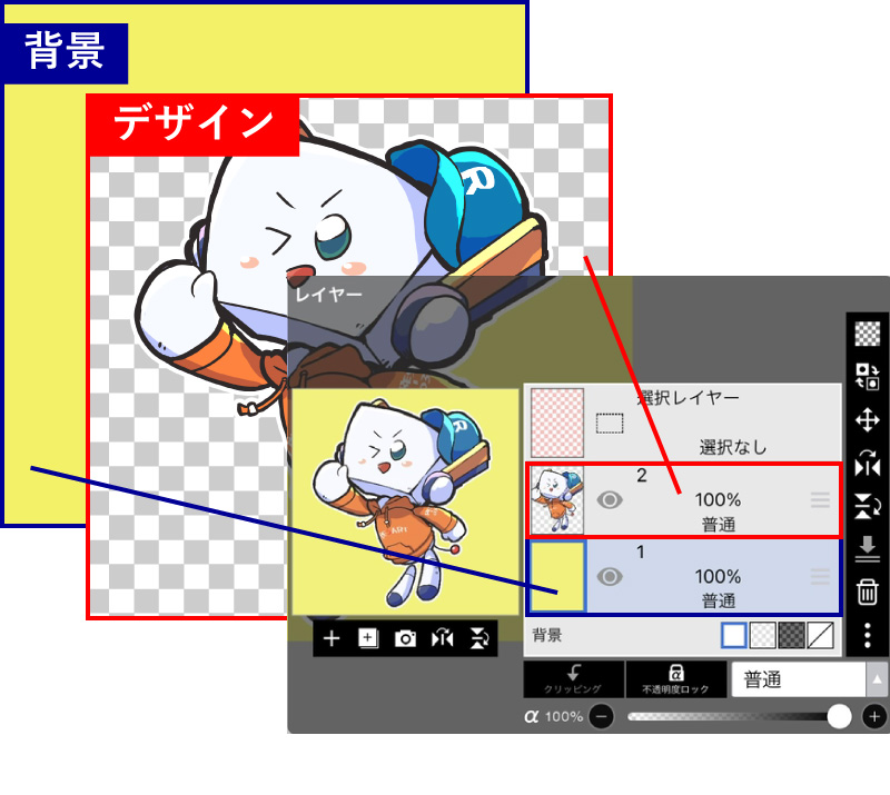 Tシャツの色などのプリントには含まれない背景も作成する場合は、必ずデザインとはレイヤーを分けてください。