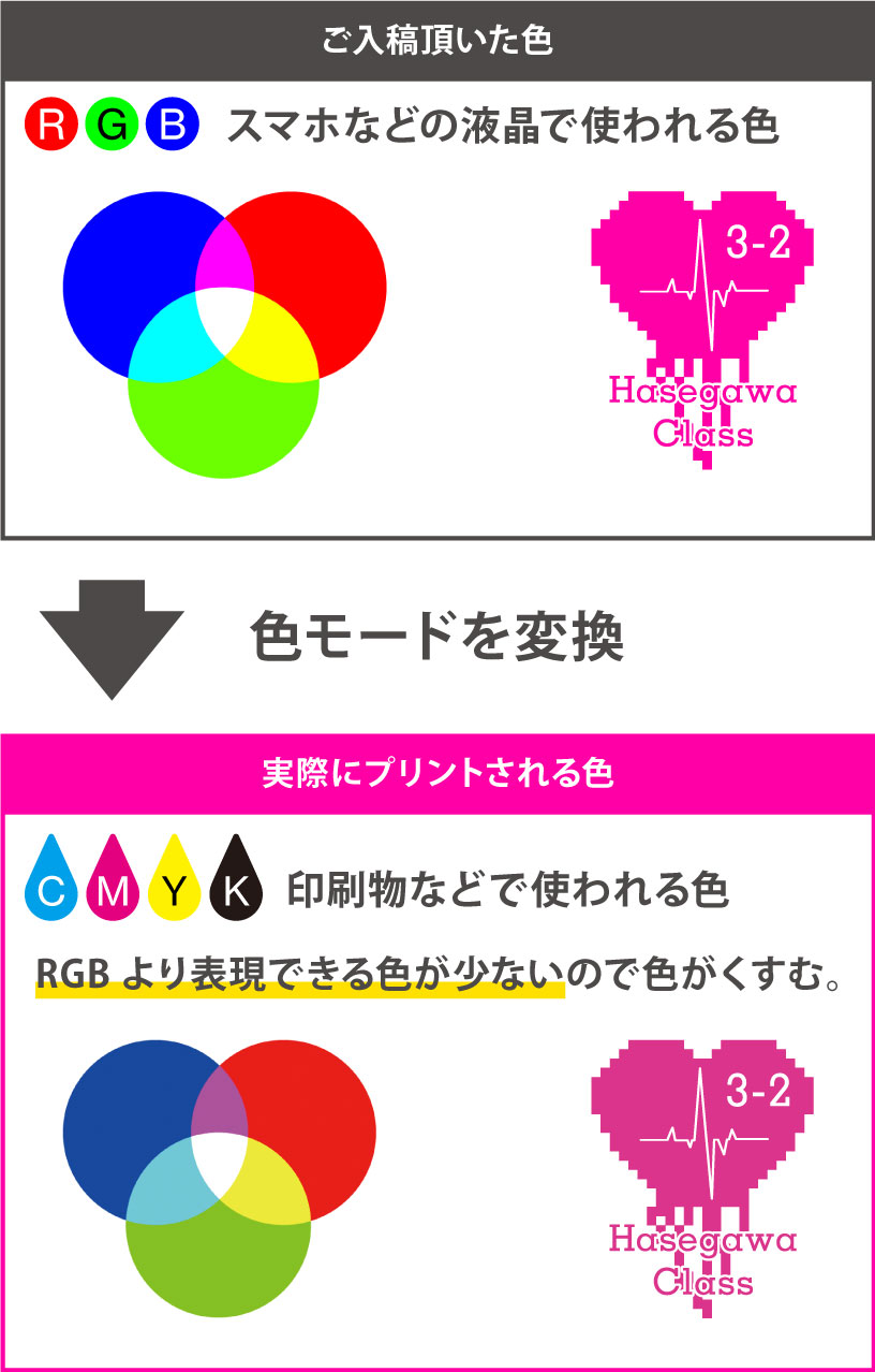 RGB形式でご入稿いただいた場合、色味が暗くなることをあらかじめご了承ください。