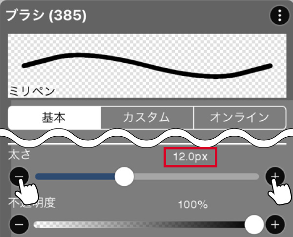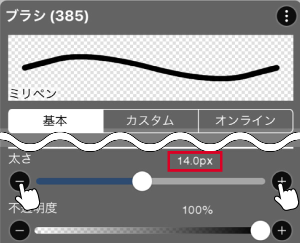 - 入り抜きペンや筆圧感知をしている場合は、線の太さが変わりますので、上図のブラシサイズよりはなるべく太目のブラシサイズで描画してください。
