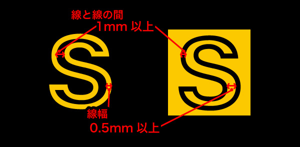 線幅が極端に細いものや線と線の幅が極端に狭いものは上手くプリントがされなかったり、線と線の間がインクで潰れてしまったりしてしまう可能性があります。