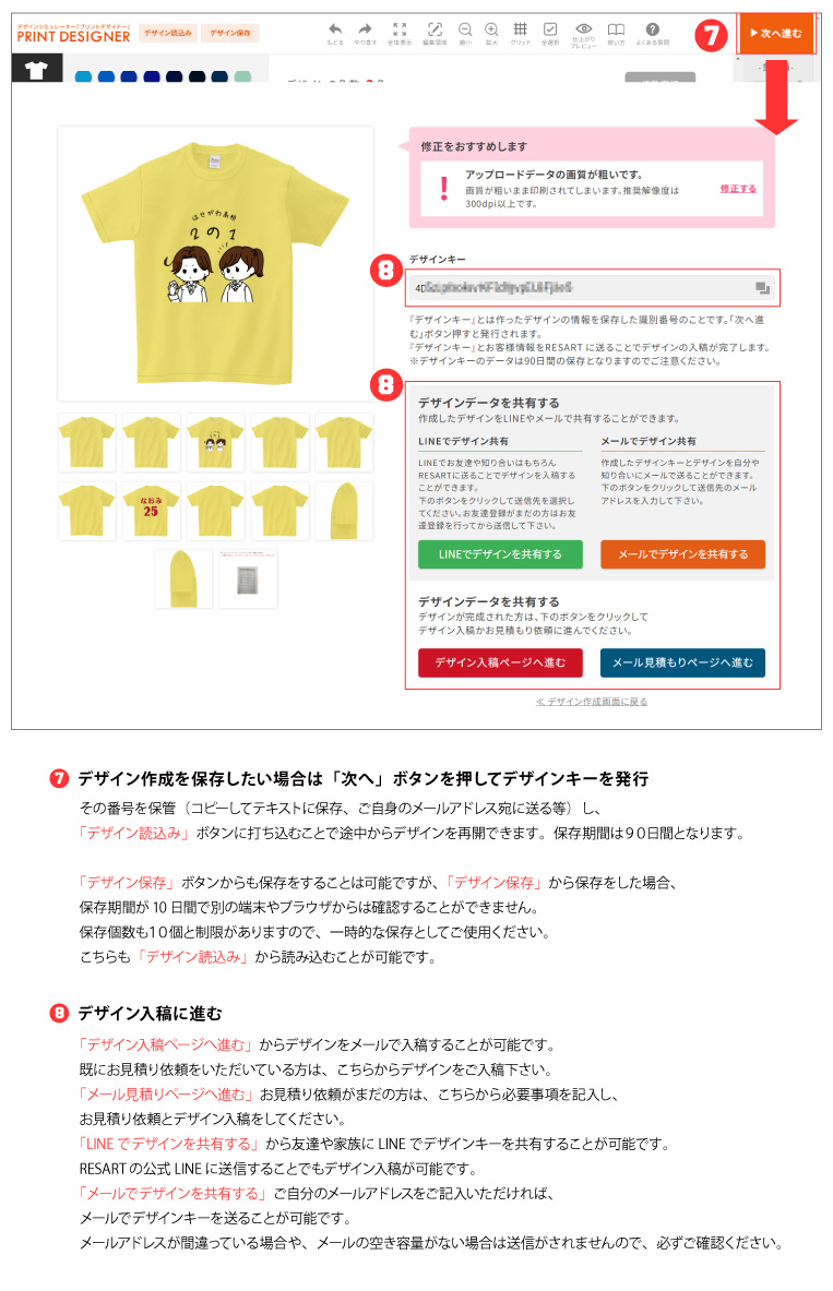 - デザイン作成が完了しましたら、デザインキーが発行されますのでデザイン入稿ページからデザインキーを送信するか、LINEやメール等でデザインキーを送信してください。