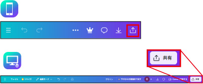 canvaでのデザイン作成が終わったら、画面右上のスマホなら『↑ボタン』、パソコンなら『共有ボタン』を押してください。