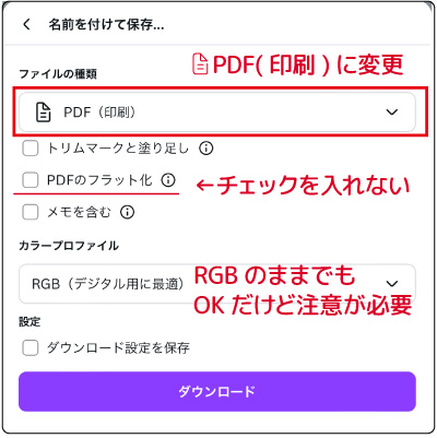 Canvaで作成したデータについては、必ずPDF(印刷)でお送りください。