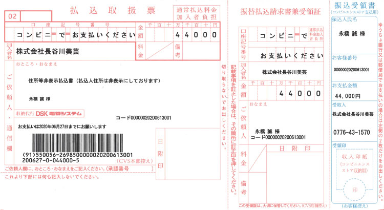 ・払込票発行から2週間以内のお支払いとなります。必ずお支払い期限をご確認ください。