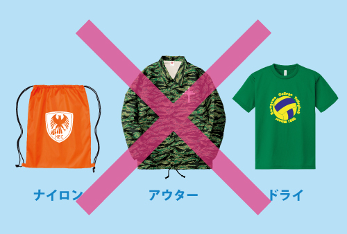 化学繊維の素材はインクを弾いてしまうため、プリント出来ません。