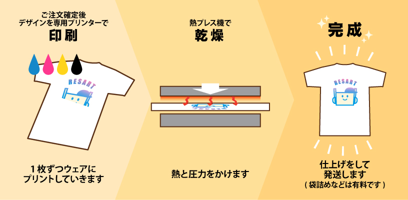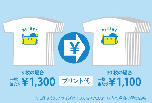 シルクプリントに比べるとプリント料金が高く、枚数によるコストダウンが低くなります。枚数やプリントサイズによっては、シルクプリントの方が安くなります。
