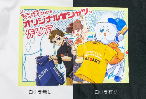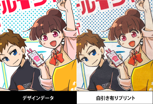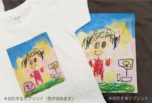 全ての生地で色合いを同じにしたい場合は、淡い色の生地にも白引き有りプリントをされることをお勧めします。