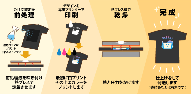 白引き有りインクジェットプリントの場合、生地に白プリントを定着させるための前処理剤を塗り、高温による熱プレスを行う必要があります。