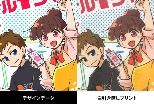 白引き無しインクジェットプリントはホワイトをプリントしないので、デザインの白色の部分はプリントされず生地そのものの色となります。