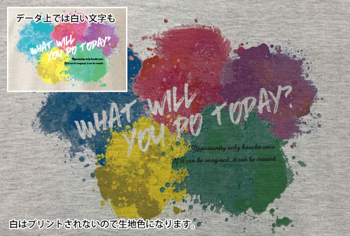 淡色ボディに白引き無しでダイレクトにインクジェットプリントした場合は、素材の地色に左右されます。
