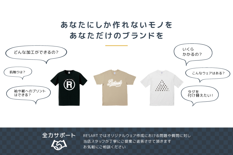 当店では地色に対して基本1色で制作します。基本地色はホワイトもしくはブラックとなります。