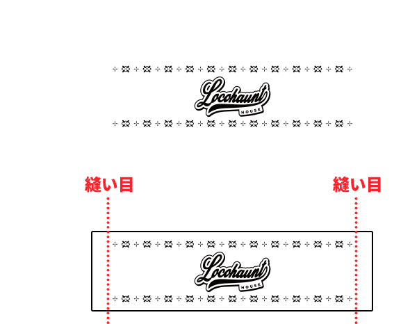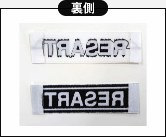 織ネームの場合デザインによってデザイン部分だけではなく、フルに織り込んで(フルパック)ネームを制作する必要があります。その場合、上図のように糸の色の影響で表側の色が本来の色と違って見える必要がございますのでご注意下さい。