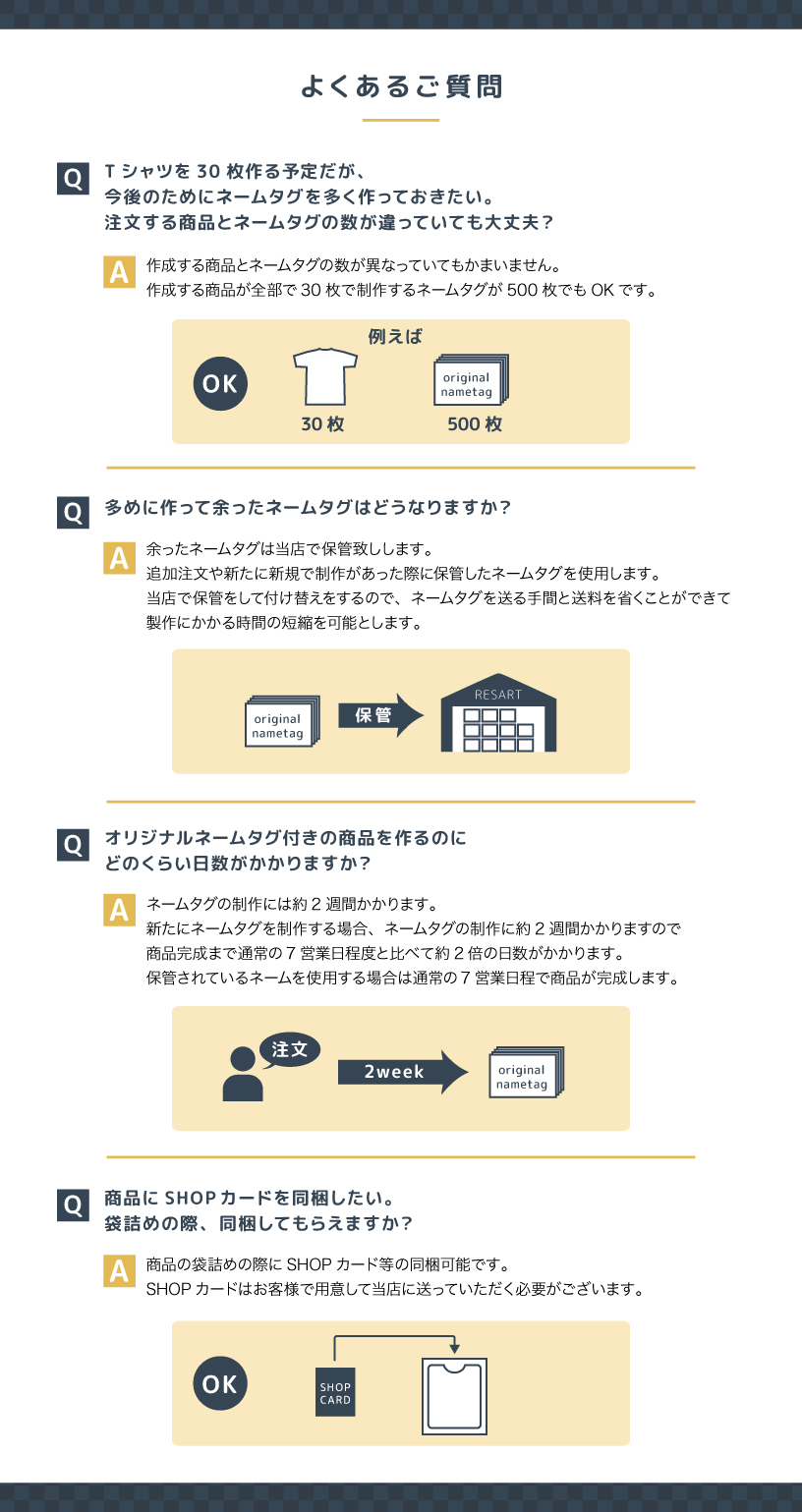 - タグの製作だけで約2週間かかり、その後プリントをするのに7営業日お時間がかかりますので、ご注意ください。