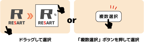 または「複数選択」のボタンを押して選択したいスタンプをクリック、もしくは「複数選択」のボタンを押して配置順(重ね順)に表示されたスタンプをクリックで複数選択できます。