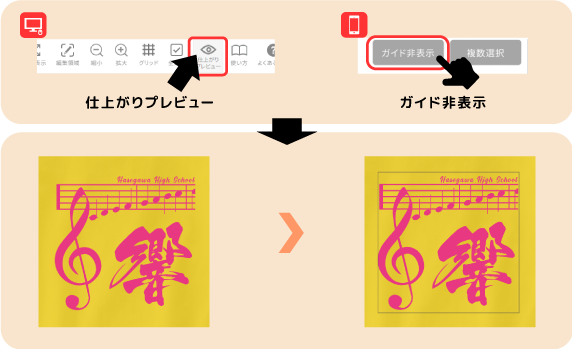 PC版プリントデザイナーをご使用の場合は上のメニューバーの『仕上がりプレビュー』をクリックし、 スマホ版は画面上の『ガイド非表示』をタップしていただくとガイドが削除できます。