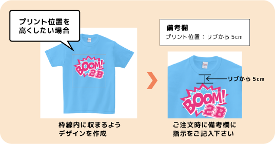 プリント位置のご指定がある場合は、ガイド線に収まるようにデザインを作成し、ご注文時に備考欄にご記入ください。