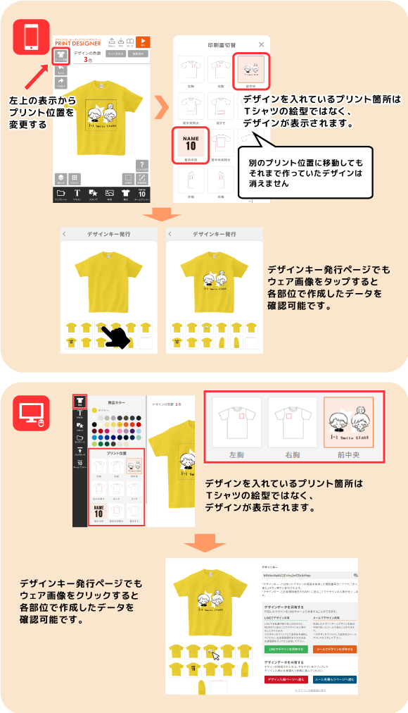 デザインキー発行ページ(デザイン保存orデザイン完了)でも、それぞれのプリント位置で作ったデータを確認出来ます。