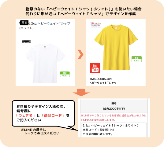 場合はどうすればいいですか?使いたいウェアがプリントデザイナーに登録されていない場合、形が似たウェアを選択してデザインを作成頂き、お見積りやデザイン入稿の際に使用したいウェア(ウェア名、商品コード)を備考欄にご記入ください。