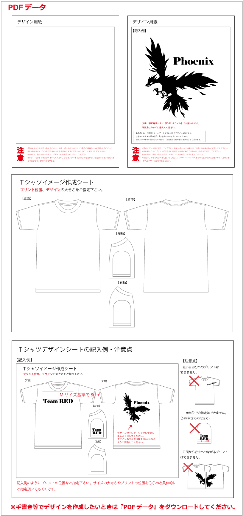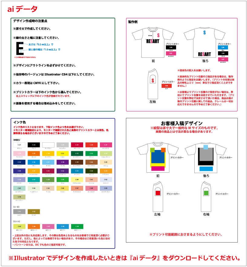 Illustratorでデザインを作成するときに便利な『aiデータ』と、手書きでデザインを作成するときに便利な『PDFデータ』と2種類のテンプレートを準備しております。デザインの作成方法にあわせにお役立て下さい。