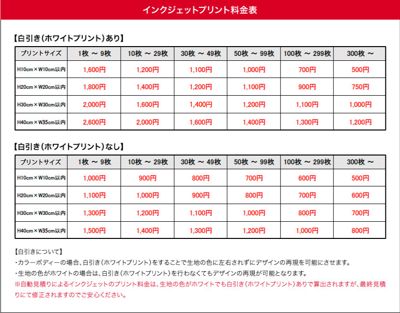 ※製作する商品の枚数が多くなれば多くなるほど、プリント代は安くなっていき、お値打ちな価格となります。