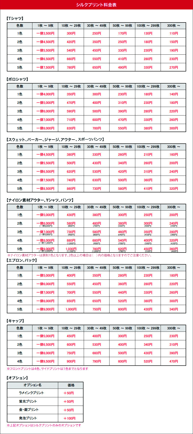 シルクプリントの料金設定は「アイテム代+版代+プリント代・オプション代+送料」となります。