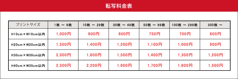 転写の料金設定は「アイテム代+プリント代・オプション代+送料」となります。 色数に制限がなくフルカラーの表現に最適で、生地に直接プリントするのではなく、一旦専用のシートに印刷して業務用プレス機で圧着する方法で、手触りが多少固めとなります。 多色マーク、写真などシルクプリントでは表現できない色表現、ボカシ、グラデーションなどの表現に適しています。 ※当サイトの価格はすべて税抜き表記となっています。
