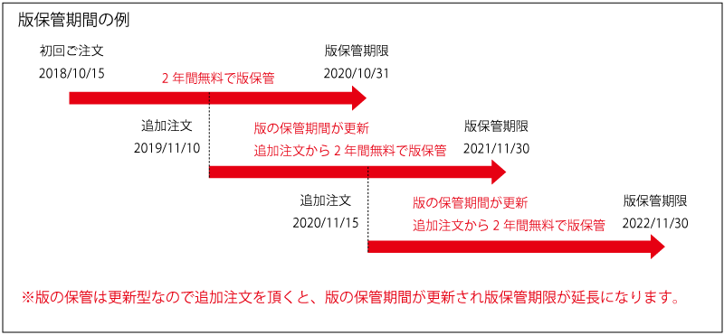 更新タイプとなりますので、版の保管期間内に追加のご注文を頂くと追加ご注文日から再び2年間版の保管が無料となります。