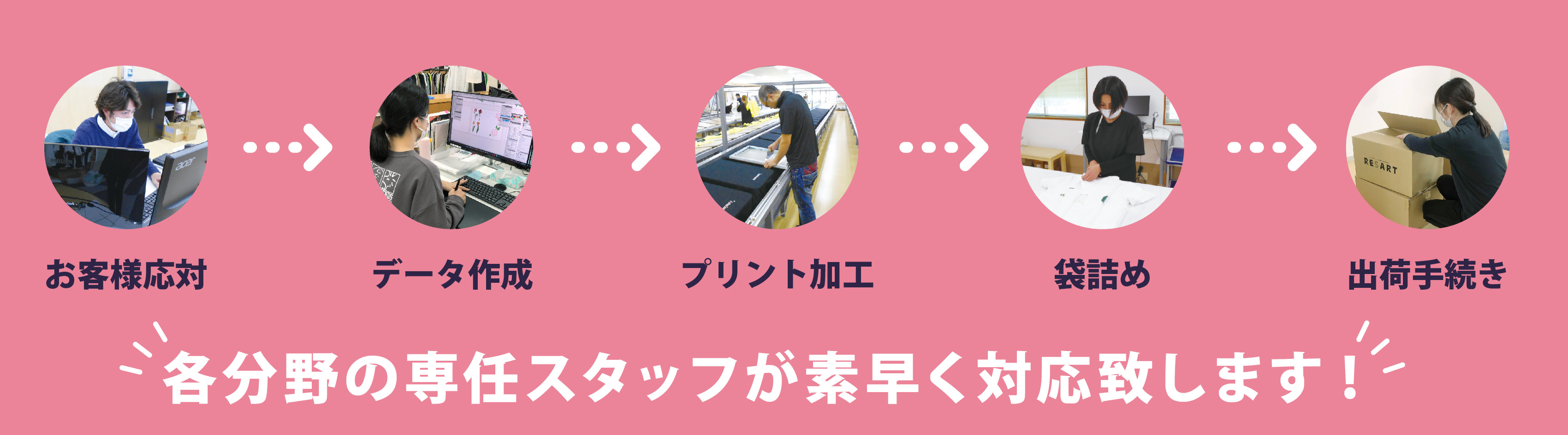 お客様応対、プリントデータの作成、プリント加工、袋詰め、出荷手続きと
