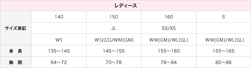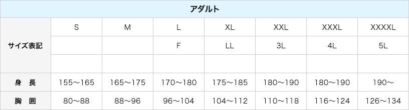 こちらの表はあくまでもお客様に合うサイズの商品を知っていただくための目安です。 年齢や体型などにより個人差がありますのでご注意ください。また、商品によっても異なりますので詳しくは各商品詳細のサイズ表で寸法をご確認ください。