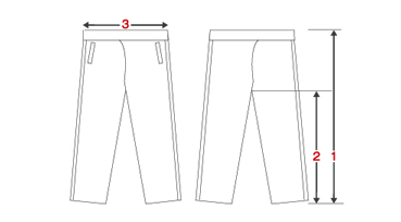 1.総丈:ウエスト上端〜脇の縫い目に沿って裾まで |